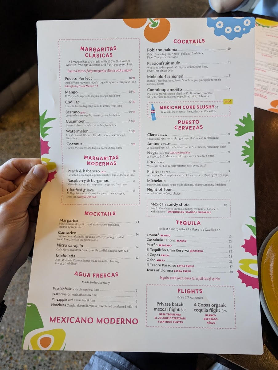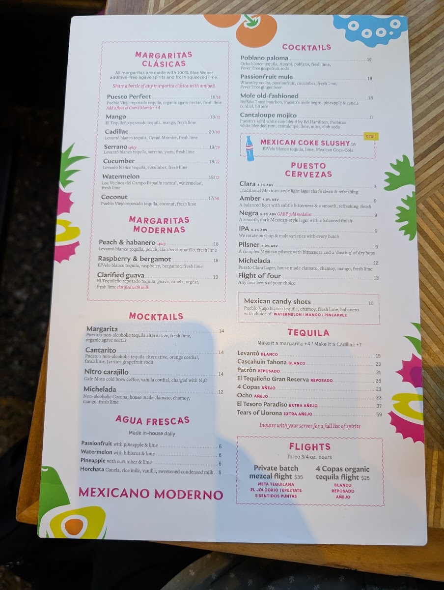 The drink menu is equally enticing, featuring a selection of cocktails designed to elevate your dining experience. Signature offerings like the Puesto Perfect Margarita and the unique Mole Old Fashioned blend traditional flavors with modern twists, ensuring you’re sipping on something special with your meal. For those looking to cool down, the Mexican Coke Slushy and Cantaloupe Mojito are refreshing options that delight in their creativity.