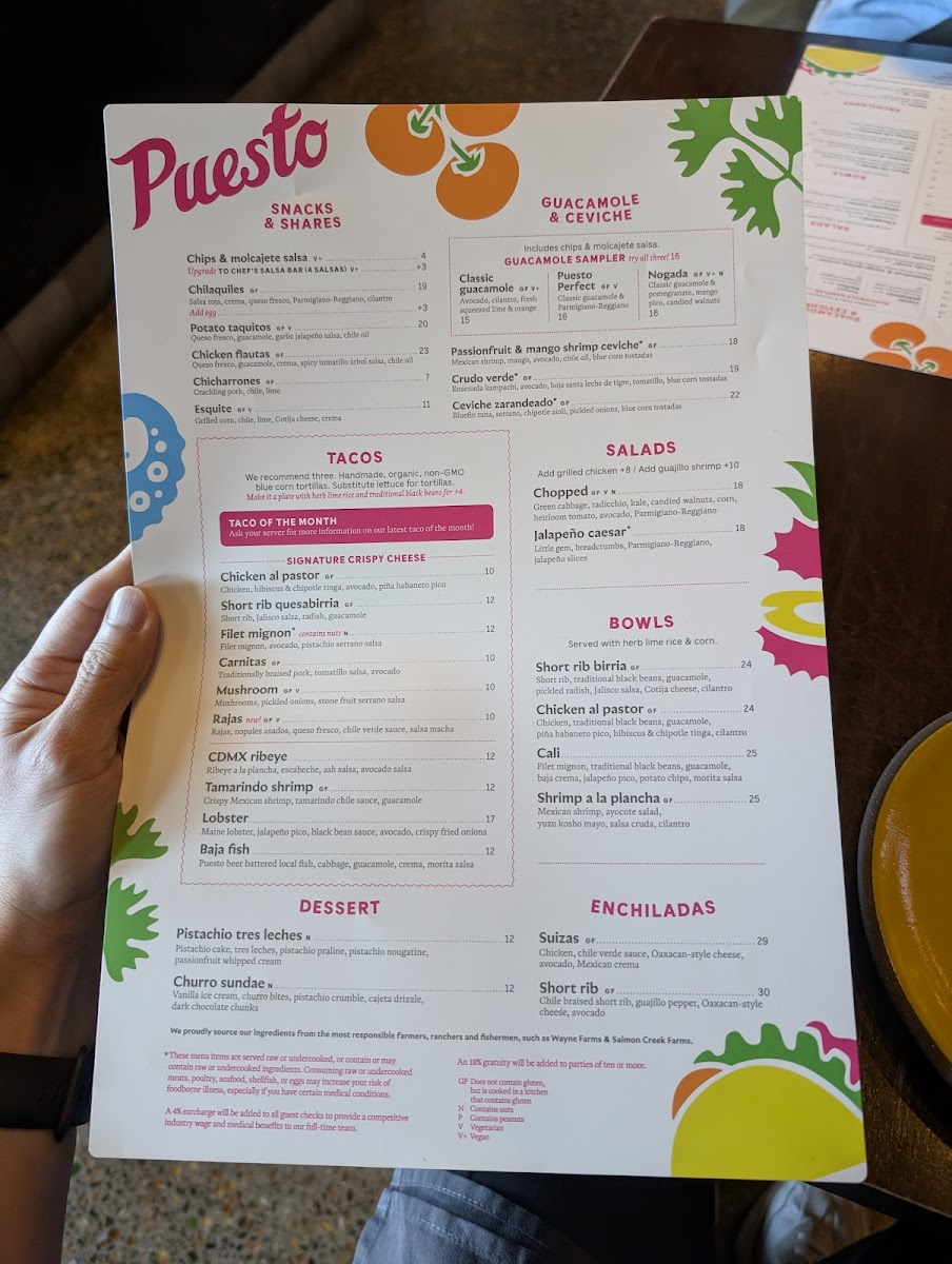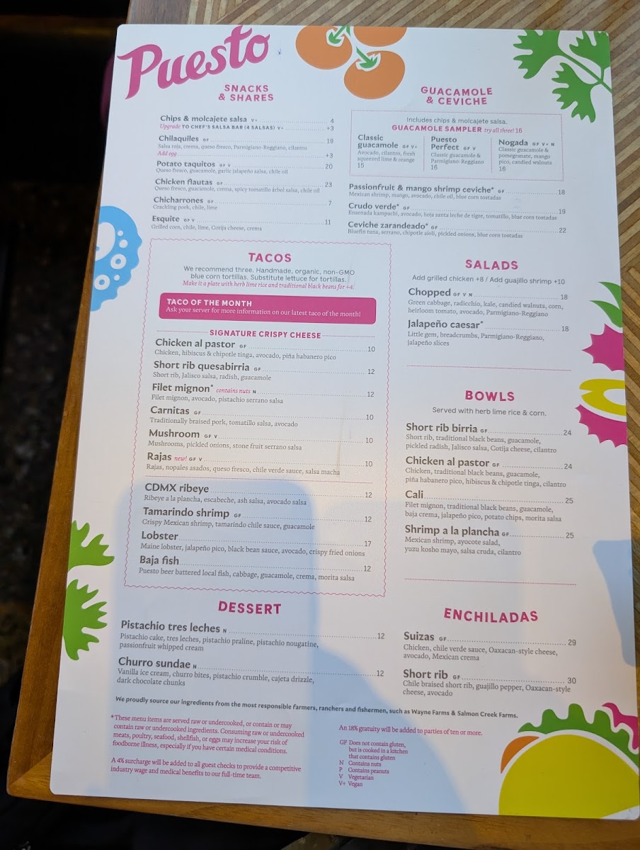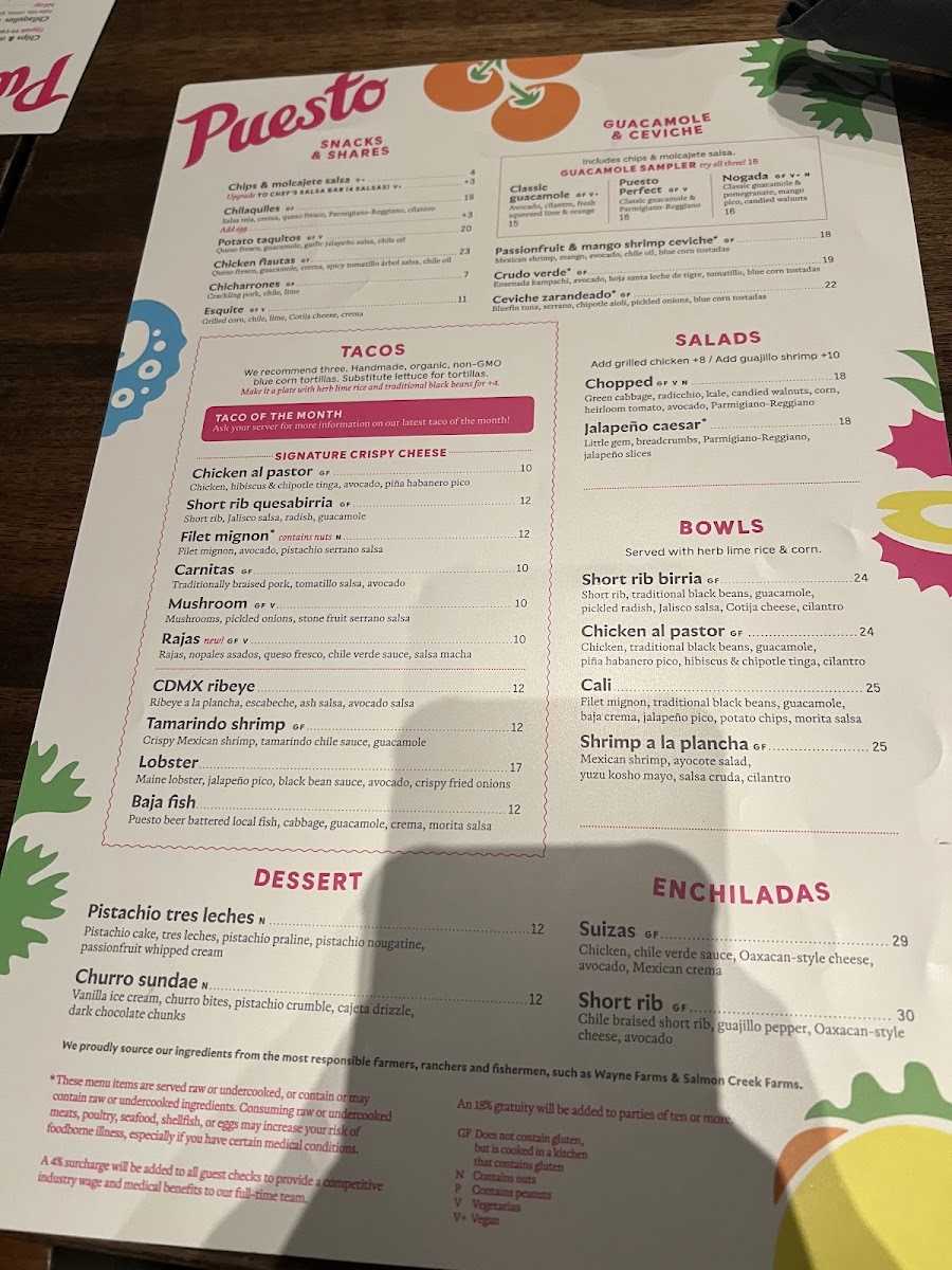 Puesto absolutely delivers! From the moment we walked in, the vibe was spot-on—upscale and trendy with an almost Amazonian feel, lush and vibrant. The bar is stunning and sets the tone for a fun, elevated dining experience. We started with the chips & molcajete salsa and the classic guac—both super fresh and packed with flavor. Then came the passion fruit & mango shrimp ceviche and yellowfin tuna crudo… just wow. So refreshing, bright, and beautifully plated. The tamarindo shrimp tacos were a flavor bomb—sweet, tangy, and perfectly balanced. But what really made the night was the bartender. We sat at the bar and got completely spoiled with tequila tastings—he walked us through flavor profiles, suggested perfect pairings, and made us feel like VIPs. You can tell they take pride in the experience just as much as the food. Can’t wait to come back—Puesto is a whole vibe.